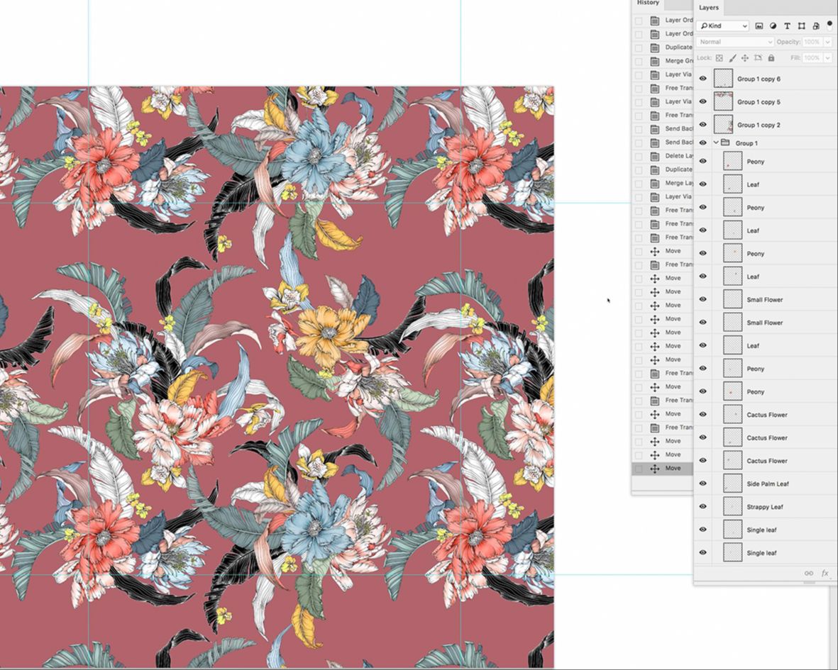 Learn to take your hand‑drawn illustrations through every Photoshop step — from scanning and clean‑up to colourways, layout and a production‑ready repeat