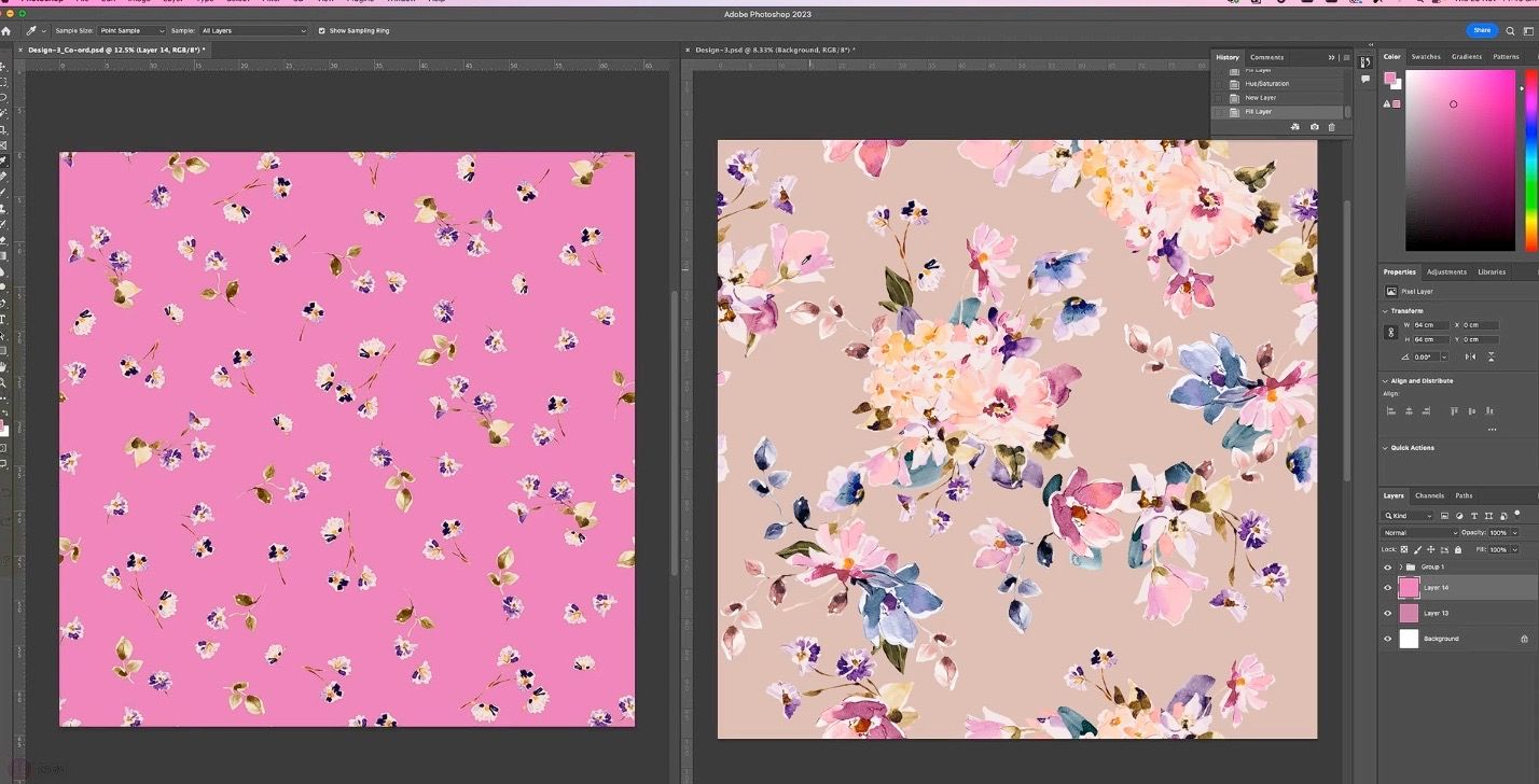 Coordinates are simpler, supporting designs that complement a hero print, adding versatility and value for clients. They’re quick to create and work well for homewares, stationery, or fashion collections.